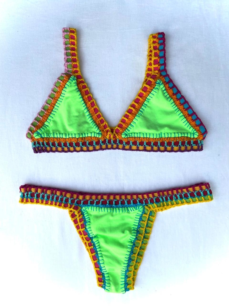 Biquíni feito com lycra de qualidade (Rosset), forro anti-transparência, detalhe e acabamento em elástico e crochê antialérgico.