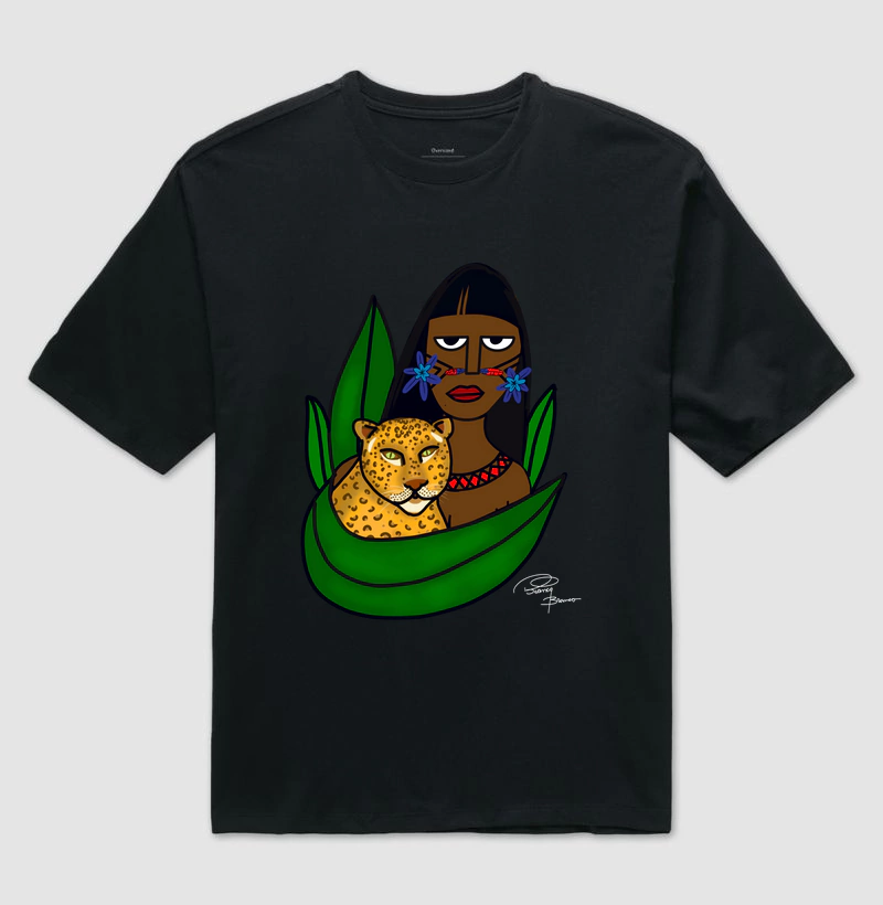 Nesta estampa, ela retrata Iara, figura presente em diversas tradições indígenas — ao lado da onça, símbolo de força, proteção e conexão com a floresta.